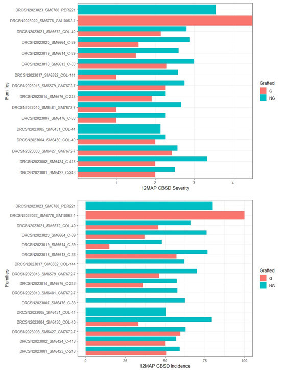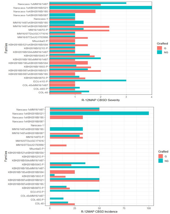 A significant negative correlation was observed between CMD and yield, whereas no relationship was found for CBSD from all four trials in this study. This implies that symptom severity of leaves cannot be used as a good secondary trait for predicting root necrosis in CBSD. However, several researchers [9,24,25] reported a negative correlation between CBSD and fresh root yield cassava. Combining laboratory data with field screening using grafting revealed that two M. glaziovii species (Table S2) from the DRC germplasm collection did not exhibit CBSD leaf symptoms (Table 3), thereby creating a new avenue for CBSD research. Several studies report M. glaziovii as a good donor for CMD resistance by introgression to M. esculenta through backcrossing [9,26,27,28].