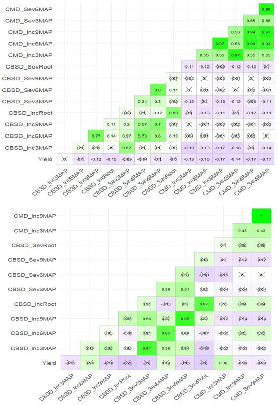 Correlation between CMD, CBSD, and yield in the DRC germplasm collection (above) and PYT Nigeria (below). Values in the figure represent the correlation coefficient.
