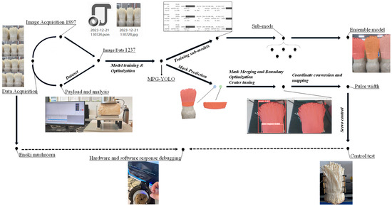 In summary, this study addresses the issue of poor cut surface quality in enoki mushrooms, which arises from improper pre-cutting grasping behavior, taking into account the mushrooms’ texture, shape, and tenderness. Building on existing research methods, the main objective of this study is to propose a visual detection model, MPG-YOLO v8, specifically designed for enoki mushrooms, to use its output data to control the clamp’s actions. Specifically, the approach integrates techniques such as Star Net, SPPECAN, and C2fDStar, which improve both detection speed and accuracy. The model employs masking techniques to address distortion in the grasping region localization caused by anchor boxes. Additionally, through optimizing mask details with mask affiliation judgment, fusion optimization, and target point refinement, the model enhances measurement precision and reduces the likelihood of grasp position prediction errors. Furthermore, by incorporating mapping with PWM control, the model overcomes the limitation of current grasping systems, enabling differentiated grasping actions on enoki mushrooms, and ultimately improving the quality of root cutting.