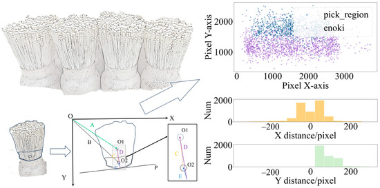 The above method was used to construct a relative positional association between the crawl position and the overall enoki mushroom to avoid excessive fluctuations in the predicted position of the ROI. To explain the location association better, the label distribution of the ‘.json’ file was counted, and the results are shown in Figure 4.