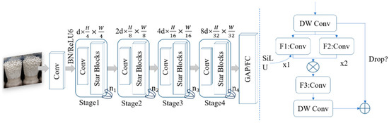 StarNet [20] involves using a four-stage hierarchical architecture for efficient image processing. Its structure includes convolutional layers for down-sampling, an enhanced feature extraction block, and batch normalization applied following a depth-wise convolution to improve its efficiency and flexibility. The activation function was replaced with ReLU instead of GELU to optimize the model performance. The detailed structure is shown in Figure 5.