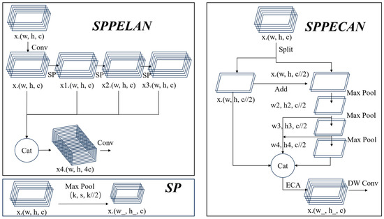 Cao [21] is a novel multilevel feature fusion method that involves combining spatial pyramid pooling (SPP) with an efficient local aggregation network (ELAN). This lightweight network structure enhances the feature extraction capability of the model through local aggregation and global integration, significantly improving its performance. By integrating the SPP with the efficient feature aggregation of ELAN, SPPELAN can be used to effectively increase generalization and accuracy without increasing the number of parameters [22,23,24].