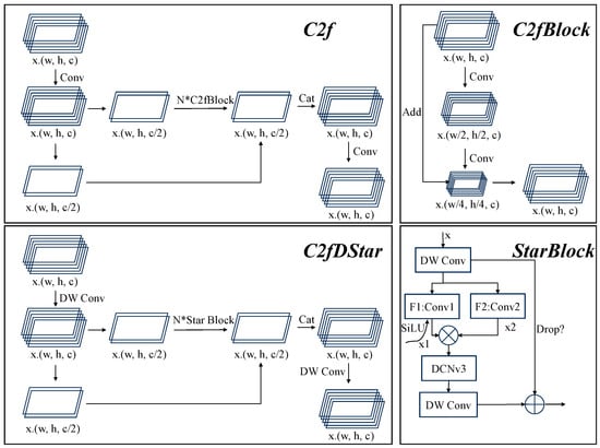 We proposed C2fDStar, an improvement based on C2f that involves incorporating the excellent ideas of StarNet. The structure and propagation path of C2fDStar are illustrated in Figure 7. The primary differences between C2fDStar and C2f are DCNv3, DW Conv, and StarBlock. This parameter-lightweight optimization is particularly valuable for real-time detection of enoki mushrooms, where efficient and fast computation is essential.
