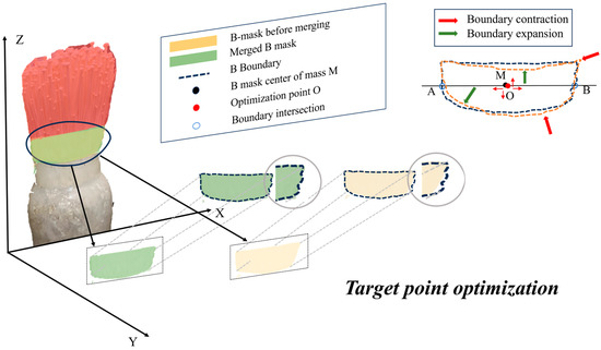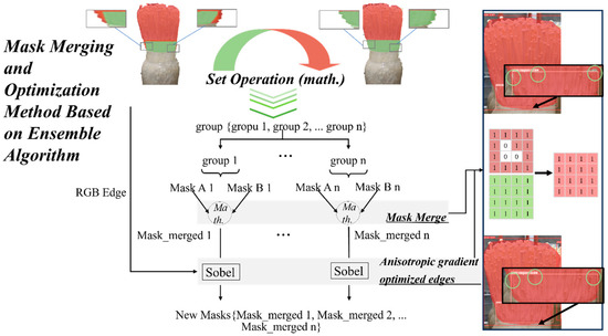 As demonstrated in the previous section, high-quality target detection and segmentation are crucial for the individualized grasping of enoki mushrooms. Experimentally, the Class B mask usually has incomplete coverage or exceeds the target boundary, causing inaccuracies in representing the contour boundary; this causes error accumulation in the subsequent coordinate calculations, affecting the grasping accuracy. To address this challenge, we proposed a mask merging and optimization method based on an ensemble algorithm, as shown in Figure 9.