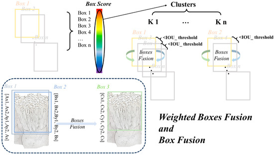 To investigate this, we conducted comparison and ensemble experiments to explore the impact of different image sizes on the prediction results. These results were combined to enhance the model’s accuracy and robustness. The WBF strategy was used in the ensemble process. This method sorts and clusters the prediction boxes based on their confidence scores and iteratively checks each box to determine which cluster it should be fused with based on the IoU_threshold (with the value set to 0.5), as illustrated in Figure 10. This process helps to reduce duplicate predictions and improve the final detection accuracy by consolidating highly overlapping boxes into a single, more accurate bounding box.
