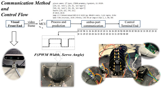 To reduce the extra computation generated by the change in the coordinate system during spatial coordinate transformation, the depth camera position was fixed in this study, and the captured images were input into the model to obtain the width information of the gripping area of the enoki mushroom. After coordinate conversion, the width value was mapped to the corresponding pulse width through the established {pixel width–pulse width–servo angle} mapping relationship to control the servo angle. The process was communicated in the IIC (inter-integrated circuit) protocol to transmit the pulse width to the servo control board. It was precisely used to control the amount of travel through the end gripper. Regarding effectiveness, whether the error between the width of the gripper hand and the width of the ROI of the enoki mushroom after driving was less than a threshold value was considered an indicator. Regarding communication protocol and data processing, because the initial serial port information was difficult to distinguish between multiple messages, we adopted the method of self-defined data frames; that is, the data sent from the serial port were in the form of frame header (‘/xC0’, ‘/x0C’) + width information + frame tail (‘/xD9’, ‘/x9D’), which helps ensure the synchronization of information transmission and the integrity of information decoding.