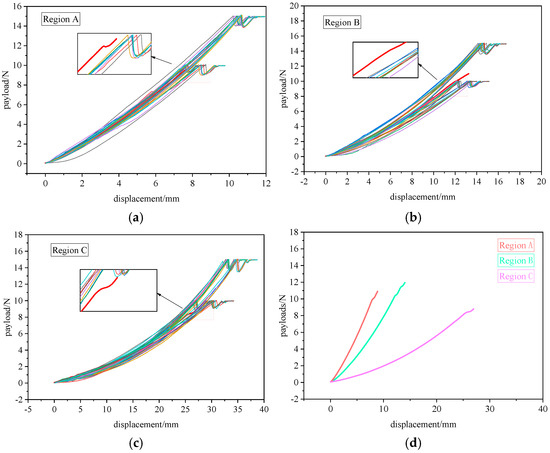 Compression experimental curves of three regions of bottle-planted enoki mushrooms. (a) Force curves of Region A under different compression conditions. (b) Force curves of Region B under different compression conditions. (c) Force curves of Region C under different compression conditions. (d) Fitting of multiple load-displacement curves in three regions.