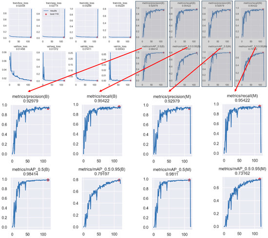 The mAP was chosen as the detection and segmentation accuracies evaluation index. The higher the mAP value, the better the detection and segmentation effect of the model. The IoU was set with different thresholds to calculate the mAP values in the experiment. In this study, the mAP50-95, precision, and recall were selected as the evaluation indices of the model. Among them, mAP50-95 denotes the mean value of mAP for all IoU values in the interval from 0.5 to 0.95, with an increment of 0.05, and mAP50 denotes the mAP when the IoU is 0.5. In addition, the filling and adjustment error were set to further verify the algorithm’s feasibility; where S represents the area of pixels within the ground truth boundary, represents the area of optimized mask pixels, represents the width of the grasped width after the pixel coordinate conversion, and L represents the width after its successful manual adjustment.