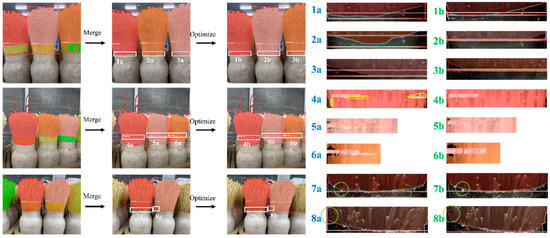 It is undeniable that this study also has some limitations. While the mask merging algorithm effectively enables parent–child determination and merging, some low-quality masks persist (shown in Figure 17). Figure 17 (5b and 6b) shows that the optimized ROI still contains noticeable internal gaps. Several factors contribute to this issue: 1. The quality of the initial mask is poor. The regions 4a, 5a, and 6a exhibit varying degrees of internal gaps, with 5a and 6a being more severely affected. Consequently, the mask quality after processing 5b and 6b does not improve to the same level as that of 4b. 2. Occlusion and overlap issues arise. It is evident that the ROI region of the enoki mushrooms in Figure 17 (5a and 6a), particularly 6a, overlaps with the enoki mushroom bodies of other clusters, leading to occlusion. This overlap introduces noise, adversely impacting feature extraction and reducing the mask quality. An analysis of the locations where low-quality masks occur indicates that the most severe internal disconnections are found along the boundaries of enoki mushrooms, where overlapping structures often lead to recognition confusion. In contrast, Figure 17 (1a–3a, 7a, and 8a) does not exhibit this issue, as these regions contain no overlapping objects. This suggests that the primary cause of internal mask disconnections is the model’s limited ability to distinguish boundary features in cases of enoki mushroom overlap. Addressing this issue could involve enhancing image data to increase diversity. Additionally, Figure 19 highlights a notable difference in ROI detection accuracy before and after model integration. Prior to integration, even when excluding ROIs with incomplete shots, some complete ROIs were misclassified as undetectable. However, applying an ensemble model approach successfully detected these previously unrecognized regions, suggesting that the robustness of individual sub-models still requires further improvement.