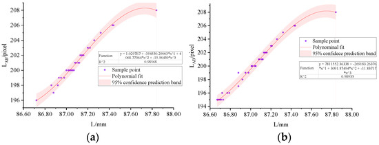 In the mapping relationship of “pixel width—pulse width—servo angle”, the “pixel width—pulse width” link is crucial as it determines the severity of error accumulation. The key to this link is in the accuracy of the “pixel width—actual width” conversion. To explore this, we selected 41 enoki mushrooms and divided them into experimental and validation groups in a ratio of 31:10. Parameter measurements and tests were conducted on 31 mushrooms in the experimental group. The results are shown in Figure 18. It reveals each sample’s LAB and L values, fitting curves, function names, and prediction bands corresponding to a 95% confidence level. Figure 18a shows that when the growth width of the grasping region was between 87 and 87.2 mm, the prediction band was narrower, indicating a higher prediction accuracy in this range. Conversely, experimental targets with growth parameters outside this range may exhibit a larger error range, possibly owing to insufficient data for such targets.