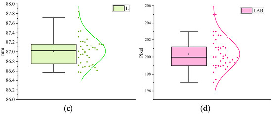 To address this, we augmented the data for these targets by rotating, redetecting, and measuring them from different directions. After data augmentation, the prediction band for the L < 86.80 mm part converged significantly, and the R2 increased from 0.98568 to 0.98933 (Figure 18b); this indicates that the mapping data are valid and well-fitted, ensuring the reliability of the data after coordinate transformation. Figure 18c,d reveals the statistical analysis using a box line diagram, including the full mapping parameters in this study. There were only a few data outliers in the graph, among which the outliers in Figure 18c originated from the abnormal growth of individual enoki mushrooms; the distribution of outliers in Figure 18d is similar to that of Figure 18c, which confirms the reliability of the mapping of ‘pixel width—actual width’.