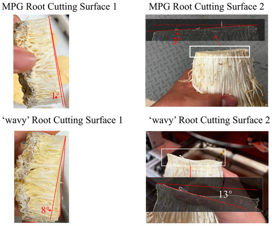 Finally, the device was integrated into the constructed experimental platform for test cutting. A total of 100 enoki mushrooms were tested for root cutting, with 96 successfully achieving effective and accurate differentiated control, resulting in a success rate of 96%. Among these 96 mushrooms, 94 met the quality requirements after root cutting, achieving a qualified cut surface rate of 98%. The results are shown in Figure 20. Surfaces 1 and 2 represent the root section detached after cutting and the cross-section of the finished enoki mushroom, respectively. The MPG surfaces were complete, with good flatness, and the angle between the cut surface and the horizontal plane did not exceed 5°. The results demonstrate that the method proposed in this study effectively alleviates the issue of ‘wavy’ cut surfaces, leading to significant improvements in product quality.