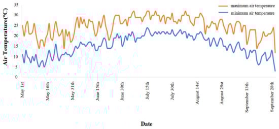 The experimental soybean variety used in this study is the drought-sensitive “Sui Nong 26”, which has an indeterminate pod-setting habit and a growth period of approximately 120 days. The experiment was conducted in 2024 at the National Engineering Technology Research Center for Minor Grain Crops in Daqing City, Heilongjiang Province, China (Latitude 46°39′ N, Longitude 124°51′ E). The location experiences an average annual sunshine duration of 2843.5 h and an average annual temperature of 4.9 °C. The maximum and minimum air temperatures are shown in Figure 1. The experimental soil used was calcareous black calcium soil, collected from the plow layer (20 cm depth) of the test base of the University of Heilongjiang Bayi Agricultural. The basic fertility of the soil was as follows: alkali-hydrolyzable nitrogen 74.75 mg kg−1, available phosphorus 31.30 mg kg−1, available potassium 115 mg kg−1, organic matter 37.17 g kg−1, and pH 8.06.