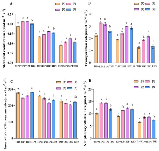 As shown in Figure 2D, under T1 conditions, the Pn under the P0 treatment was significantly reduced by 30% and 29.6%, respectively, compared to the P1 and P2 treatments where there was no significant difference between P1 and P2. Under T2 conditions, when the Pn under P2 reached 12.76 μmol·m−2·s−1, it significantly increased by 37.4% compared to P0. Under T3 conditions, the Pn under P1 and P2 was significantly increased by 31.4% and 33.4% compared to P0 where there was no significant difference between P1 and P2.