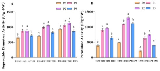 The effect of phosphorus application on (A) superoxide dismutase activity, (B) peroxidase activity under water stress. The lowercase letters (a, b, c, and d) in the figure represent the results of the statistical analysis for significant differences. Identical letters within the same group indicate no significant difference statistically (p > 0.05), while different letters indicate significant differences (p < 0.05).