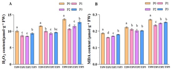 The effect of phosphorus application on (A) hydrogen peroxide content, and (B) malondialdehyde content under water stress. The lowercase letters (a, b, c, and d) in the figure represent the results of the statistical analysis for significant differences. Identical letters within the same group indicate no significant difference statistically (p > 0.05), while different letters indicate significant differences (p < 0.05).