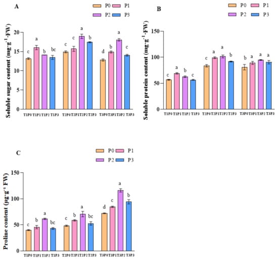 The effect of phosphorus application on (A) soluble sugar content, (B) soluble protein content, and (C) proline content under water stress. The lowercase letters (a, b, c, and d) in the figure represent the results of the statistical analysis for significant differences. Identical letters within the same group indicate no significant difference statistically (p > 0.05), while different letters indicate significant differences (p < 0.05).
