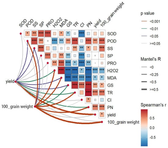 The results of the Mantel test showed strong correlations between yield and 100-seed weight with SOD, POD activity, SS, SP, PRO, Pn, and Gs (Mantel’s R > 0.5, p < 0.001), with yield showing a higher correlation than 100-seed weight. In addition, the correlations between H2O2 and MDA and both yield and 100-seed weight were weak (Mantel’s R < 0.25), but they all exhibited a negative correlation trend.