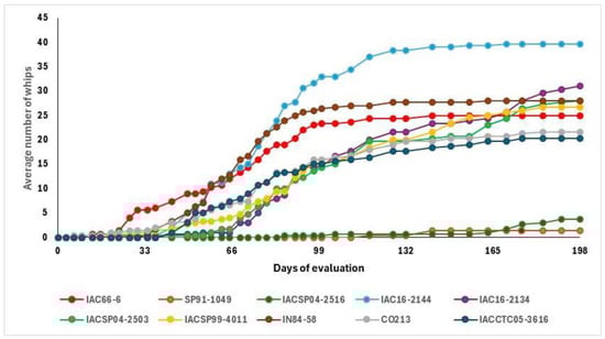 Average number of whips in ten sugarcane genotypes (IAC66-6; SP91-1049; IACSP04-2516; IAC16-2144; IAC16-2134; IACSP04-2503; IACSP99-4011; IN84-58; Co213; and IACCTC05-3616) screened in greenhouse over period of 198 days.