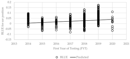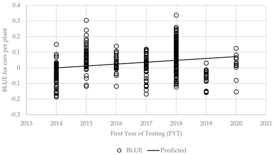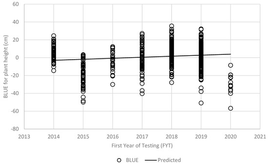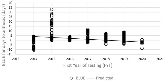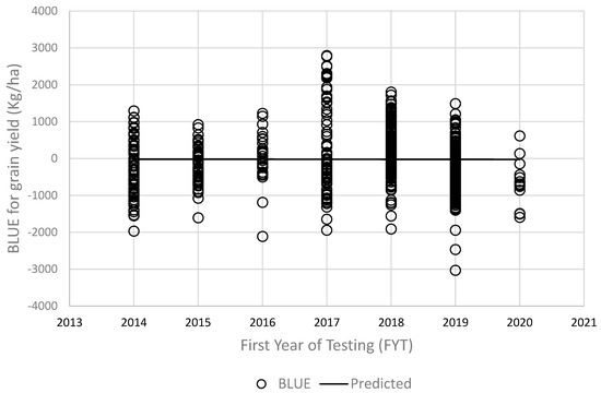 where is the phenotypic value for genotype i tested in control group j, year k, experiment l, and replicate m; is the overall mean; is the fixed effect of the ith genotype; is the fixed effect of the jth control, where j = 1 for the control population consisting of the checks and j = 2 for the hybrid group; is a random effect for the kth year, with ); is a random effect for the lth experiment nested in the kth year, with ); gyik is the random effect of the interaction of the ith genotype and kth year, with ); gx(y)ikl is the random effect of the interaction of the ith genotype and lth experiment nested in the kth year, with ); is a random effect of the mth replication nested in the lth experiment, with ); and is the residual error, with . Data from experiments with an entry-mean heritability (hereinafter referred to as broad-sense heritability and denoted by H) of <0.20 were excluded from the analysis. The analysis provided the BLUE for each genotype. The first year of testing (FYT) for each genotype was assigned as the first year for which the genotype was tested in the AYT or VCU trials. The genetic gain was estimated by regressing the BLUE of each line onto its FYT value. This approach has been reported before [26,27,28,29].