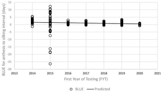 Genetic gain for the anthesis–silking interval in maize genotypes evaluated in advanced trials conducted by the Mozambique maize breeding program between 2014 and 2020. Best linear unbiased estimates (BLUEs) are expressed relative to the mean of 3.53 days.