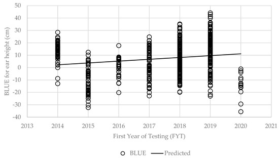 The plant height varied from 41.5 cm to 287 cm, with a mean of 169.1 cm, and the plants continued to become significantly (p = 0.002) taller at a rate of 0.68% per year over the seven years (Table 5 and Figure 4). The ear height ranged from 14 cm to 180 cm, with a mean of 83.9 cm and a significant gain (p < 0.001) of 1.74% per year (Table 5 and Figure 5).
