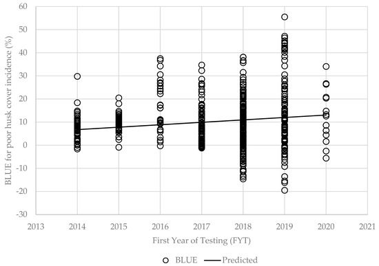 The incidence of poor husk cover ranged from 0 to 100%, with a mean of 16.9.0%, and it increased significantly (p < 0.001) by 6.2% per year (Table 5 and Figure 8).