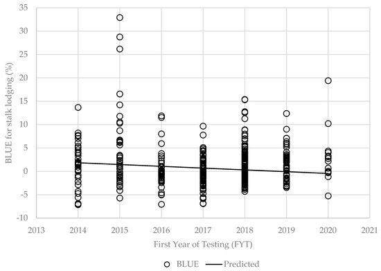 Genetic gain for stalk lodging in maize genotypes evaluated in advanced trials by the Mozambique maize breeding program between 2014 and 2020. The best linear unbiased estimates (BLUEs) are expressed relative to the mean of 5.44%.