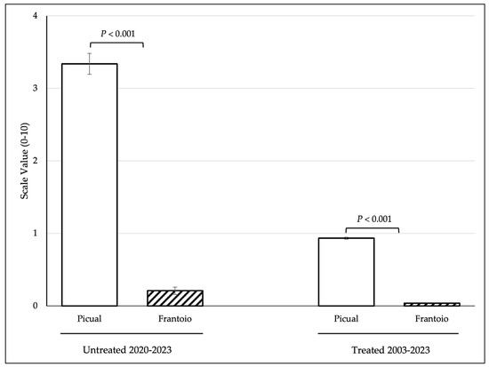 To evaluate the durability of olive resistance to S. oleagina, the incidence of affected leaves was estimated under field conditions in mixed-cultivar olive orchards over 20 years. During this time, fungicide-sprayed olives of the susceptible cv Picual showed a disease severity of 0.9 on a rating scale of 0–10. In untreated olives, disease severity reached 3.4, corresponding to four to nine affected leaves per quadrant of the tree canopy. On the other hand, the Frantoio cultivar exhibited remarkable resistance, with disease incidence consistently (p < 0.001) in both treated and untreated trees, equating to only one to three affected leaves per tree (Figure 2).
