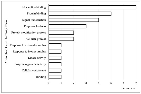 A total of 14 protein sequences were functionally classified into one or more ontologies; 14 sequences (100%) were classified according to “molecular function”, 1 (7%) was classified by “cellular component”, 8 (57%) were classified in terms of “biological process”, and 1 (7%) was classified in all three categories. Some of these protein sequences were also classified into different groups according to their GO annotation. For example, based on the GO annotation for the sequences in the “biological process” category, a consistent biological significance emerged, providing better insights into their roles. The binding function is supported by the terms ‘nucleotide binding’ (seven sequences) and ‘protein binding’ (five sequences), also with significant categories such as ‘signal transduction’ (four sequences) and ‘response to stress’ (three sequences). The distribution of GO terms is shown in Figure 3 (Table S1).