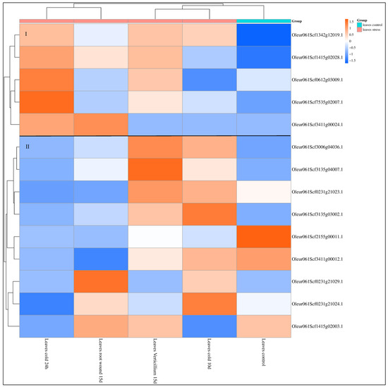 The heatmap expression level of 14 sequences from the OliveAtlas database includes a collection of abiotic and biotic stresses (leaves after 24 h and 10 days in cold conditions, leaves of plants with wounds in roots after 15 days, and leaves of plants infected with Verticillium dahliae for 15 days) and leaves control.