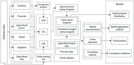 The commonly used methods for CF estimation include the economic input–output (EIO) method [18], life cycle assessment (LCA) [19] and hybrid LCA, which integrates EIO with LCA, known as EIO-LCA [20]. LCA is an effective method for evaluating the inputs, outputs and potential environmental impacts of a product system throughout its life cycle [21]. Since this method requires the collection of massive amounts of data throughout the product life cycle, the assessment scope and indicators should be primarily determined based on the research objectives and data availability. The EIO method calculates the CF of a specific production system based on a multi-sector input–output table and the interconnections and impacts between different sectors. However, in China, input–output tables are published once every five years, limiting the application of EIO in annual CF studies. Although the EIO-LCA method combines the advantages of EIO and LCA [22], it also faces similar time-interval limitations. Especially for crop production systems, existing data cannot support the construction of reliable annual input–output tables, which makes it difficult to reveal the fine spatiotemporal characteristics of agricultural CFs.