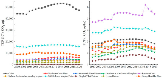 From 2000 to 2020, the agricultural TCF and FCF both increased first and then decreased in China, with a turning point in 2015 (Figure 3). The TCF increased from 44,334.88 × 104 t CO2 eq to 47,357.04 × 104 t CO2 eq, with an increase of 6.82% (3022.16 × 104 t CO2 eq). The TCFs in the Northeast China Plain and the northern arid and semiarid region increased significantly from 3948.24 × 104 t CO2 eq and 2315.62 × 104 t CO2 eq to 6537.20 × 104 t CO2 eq and 4218.17 × 104 t CO2 eq, with increases of 61.01% (2588.96× 104 t CO2 eq) and 82.16% (1902.55 × 104 t CO2 eq), respectively. However, the TCFs in Southern China and the Huang-Huai-Hai Plain decreased significantly from 4168.28 × 104 t CO2 eq and 8863.28 × 104 t CO2 eq to 3667.32 × 104 t CO2 eq and 7941.59 × 104 t CO2 eq, with decreases of −12.02% (−500.96 × 104 t CO2 eq) and −10.40% (−921.69 × 104 t CO2 eq), respectively. China’s FCF slightly declined from 2.84 t CO2 eq/ha to 2.83 t CO2 eq/ha (−0.004%). The FCFs in the Yunnan–Guizhou Plateau, the Sichuan Basin and surrounding regions, and the Huang-Huai-Hai Plain decreased by 4.02%, 6.78% and 10.10%, respectively. Other agricultural regions experienced varying degrees of increase. In particular, the FCFs in the northern arid and semiarid region and the Loess Plateau significantly increased from 1.65 t CO2 eq/ha and 1.86 t CO2 eq/ha to 2.08 t CO2 eq/ha and 2.38 t CO2 eq/ha, with increases of 26.38% and 27.94%, respectively.