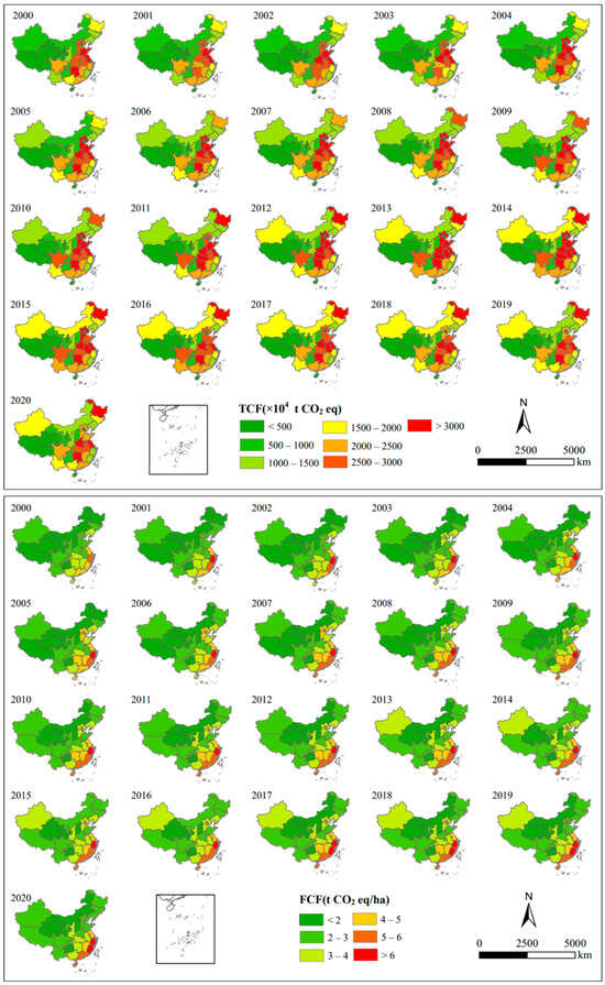Provinces with high TCFs were primarily located in East and Central China, while those in the western region generally had lower TCFs (Figure 4). Notably, the TCFs of Inner Mongolia, Heilongjiang, Tibet and Xinjiang significantly increased from 763.43 × 104 t CO2 eq, 1736.83 × 104 t CO2 eq, 29.65 × 104 t CO2 eq and 878.01 × 104 t CO2 eq to 1440.73 × 104 t CO2 eq, 3679.25 × 104 t CO2 eq, 57.29 × 104 t CO2 eq and 1815.56 × 104 t CO2 eq, with increases of 88.72%, 111.84%, 93.24% and 106.78%, respectively. Conversely, the TCFs in Beijing, Tianjin and Shanghai significantly decreased by 73.56%, 41.81% and 48.52%, from 165.07 × 104 t CO2 eq, 196.05 × 104 t CO2 eq and 293.78 × 104 t CO2 eq to 43.65 × 104 t CO2 eq, 114.08 × 104 t CO2 eq and 151.24 × 104 t CO2 eq, respectively. Both TCFs and FCFs showed spatial heterogeneity, with high values in the east and low values in the west, and the spatial clustering of the TCFs and their components has weakened over time. China’s FCFs showed spatial heterogeneity, with higher values in the east and lower values in the west and the highest value located in the southeastern coastal area. Tibet’s FCF significantly increased from 1.28 t CO2 eq/ha to 2.11 t CO2 eq/ha (64.09%). The FCFs of Heilongjiang, Fujian, Hainan, Shaanxi and Gansu increased by 32.55%, 34.55%, 35.67%, 37.03% and 39.96%, from 1.86 t CO2 eq/ha, 4.97 t CO2 eq/ha, 3.81 t CO2 eq/ha, 2.23 t CO2 eq/ha and 1.19 t CO2 eq/ha to 2.47 t CO2 eq/ha, 6.68 t CO2 eq/ha, 5.16 t CO2 eq/ha, 3.06 t CO2 eq/ha and 1.66 t CO2 eq/ha, respectively. The FCFs in Tianjin and Shandong significantly declined from 3.68 t CO2 eq/ha and 2.80 t CO2 eq/ha to 2.72 t CO2 eq/ha and 2.25 t CO2 eq/ha, with decreases of −25.99% and −19.49%, respectively.