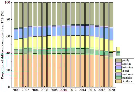 The CFs generated by various agricultural inputs made different contributions to TCFs (Figure 5). Fertilizer (39.26%) and paddies (27.38%) were the main contributors to TCFs. Among all CF components, only the CF of fertilizer decreased by 3.04%, dropping from 17,557.22 × 104 t CO2 eq to 17,023.10 × 104 t CO2 eq. The CFs from agripower and agrifilm markedly increased from 34.70 × 104 t CO2 eq and 333.86 × 104 t CO2 eq to 69.71 × 104 t CO2 eq and 597.16 × 104 t CO2 eq, with increases of 100.90% and 78.87%, respectively. The CFs from pesticides, diesel, irrigation and paddies increased by 2.64%, 31.56%, 28.50% and 0.39%, respectively.