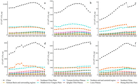Annual changes in different CFs in nine agricultural regions in China from 2000 to 2020: (a) fertilizer CFs; (b) pesticide CFs; (c) agripower CFs; (d) diesel CFs; (e) irrigation CFs; (f) agrifilm CFs.
