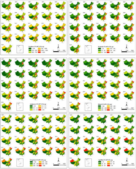 There were significant differences in CF changes among provinces (Figure 7). In Beijing, the CFs for fertilizer, pesticides, agripower, diesel and irrigation decreased substantially by 75.56%, 60.50%, 69.89%, 78.48% and 66.67%, respectively. The CFs for agripower and diesel decreased by 38.47% and 87.95% in Tianjin. Shanghai showed decreases of 77.23%, 76.06%, 43.29% and 39.62% in the CFs for fertilizer, pesticides, irrigation and agrifilm. Conversely, Inner Mongolia experienced significant increases in CFs for fertilizer, pesticides, agripower and diesel of 104.26%, 163.07%, 200.42% and 161.20%. In Xinjiang, the CFs for fertilizer, agripower and agrifilm increased by 158.64%, 244.15% and 194.67%, respectively. The CFs for pesticides and agripower increased by 138.48% and 106.09% in Jilin and by 283.78% and 319.82% in Heilongjiang. Additionally, Jilin’s diesel CF and Heilongjiang’s irrigation CF increased by 134.16% and 203.72%. Gansu’s CFs for pesticides and diesel increased by 253.15% and 131.41%. In Guizhou, the CFs for agripower and diesel increased by 317.46% and 200.00%. The CFs for agripower, diesel, irrigation and agrifilm increased by 403.76%, 442.86%, 80.73% and 1357.81% in Tibet. Agripower CFs in Hubei and Hainan and Hunan’s diesel CF increased by 227.16%, 206.42% and 101.79%, respectively. Furthermore, the CFs for agrifilm in Guangxi, Hainan, Qinghai and Ningxia increased by 174.64%, 5005.18%, 1060.06% and 241.35%, respectively.