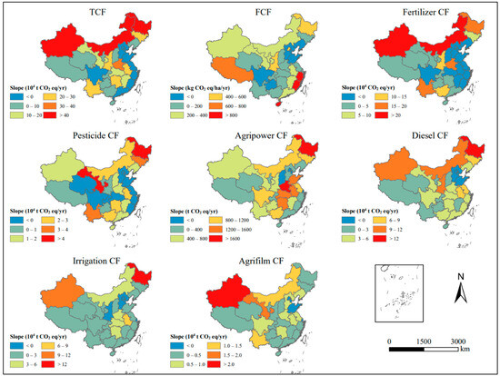 In terms of changes in different CFs, the slope values of Inner Mongolia’s CFs for fertilizer and diesel were 25.22 × 104 t CO2 eq/yr and 10.52 × 104 t CO2 eq/yr, and the slope% values were 4.02%/yr and 4.89%/yr, respectively. Conversely, the slope values for fertilizer CFs in Jiangsu and Shandong and the diesel CF in Hubei were −17.34 × 104 t CO2 eq/yr, −23.91 × 104 t CO2 eq/yr and −19.77 × 104 t CO2 eq/yr, and the slope% values were −1.24%/yr, −1.58%/yr and −1.85%/yr, respectively. Additionally, the slope values for pesticide CFs in Jiangsu, Zhejiang and Shandong were −2.54 × 104 t CO2 eq/yr, −2.29 × 104 t CO2 eq/yr and −2.64 × 104 t CO2 eq/yr, and the slope% values were −1.66%/yr, −2.17%/yr and −0.96%/yr, respectively. The slope values for Xinjiang’s CFs for fertilizer, diesel, irrigation and agrifilm were 35.77 × 104 t CO2 eq/yr, 11.16 × 104 t CO2 eq/yr, 11.88 × 104 t CO2 eq/yr and 2.64 × 104 t CO2 eq/yr, and the slope% values were 5.47%/yr, 4.59%/yr, 3.05%/yr and 5.83%/yr, respectively. The slope values for Heilongjiang’s CFs for pesticides, agripower, diesel and irrigation were 4.23 × 104 t CO2 eq/yr, 1844.81 t CO2 eq/yr, 14.04 × 104 t CO2 eq/yr and 25.04 × 104 t CO2 eq/yr, and the slope% values were 3.66%/yr, 7.22%/yr, 3.18%/yr and 6.33%/yr, respectively. The slope values for Gansu’s CFs for pesticides and agrifilm were 4.98 × 104 t CO2 eq/yr and 1.62 × 104 t CO2 eq/yr, and the slope% values were 6.54%/yr and 5.27%/yr, respectively. The slope values for Henan’s agripower CF and Shaanxi’s diesel CF were 1650.98 t CO2 eq/yr and 11.68 × 104 t CO2 eq/yr, and the slope% values were 2.71%/yr and 4.48%/yr. The slope values for Beijing’s CFs for agripower and irrigation were −100.30 t CO2 eq/yr and −0.90 × 104 t CO2 eq/yr, and the slope% values were −5.91%/yr and −4.87%/yr, respectively. The slope values for Tianjin’s agripower CF and Shanghai’s agrifilm CF were −78.42 t CO2 eq/yr and −0.12 × 104 t CO2 eq/yr, and the slope% values were −2.18%/yr and -2.43%/yr, respectively.