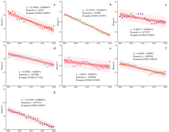 Temporal changes in Moran’s I values for TCFs and different CFs in China from 2000 to 2020: (a) TCFs; (b) fertilizer CFs; (c) pesticide CFs; (d) agripower CFs; (e) diesel CFs; (f) irrigation CFs; (g) agripower CFs.
