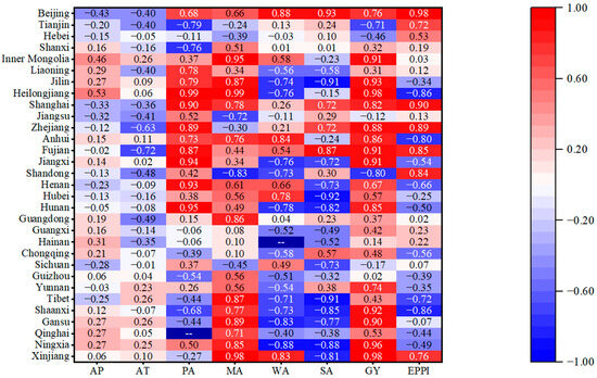 The influence of natural–anthropogenic factors on provincial TCFs showed significant differences (Figure 10). In Heilongjiang, Shanghai, Zhejiang, Fujian, Jiangxi, Henan and Hunan, TCFs showed a strong positive correlation with paddy cultivation. Maize showed a significant positive correlation with the TCFs of Inner Mongolia, Jilin, Heilongjiang, Guangdong, Tibet, Gansu, Ningxia and Xinjiang. Wheat had a strong positive correlation with TCF in Beijing, Anhui, Hubei and Xinjiang. There was a significant positive correlation between TCF and soybean production in Beijing and Fujian. Grain yield demonstrated a significant positive correlation with TCF in Inner Mongolia, Jilin, Heilongjiang, Shanghai, Zhejiang, Anhui, Fujian, Jiangxi, Hunan, Shaanxi, Gansu, Ningxia and Xinjiang. The employed population in primary industries showed a significant positive correlation with TCF in Beijing, Shanghai, Zhejiang, Fujian and Shandong. Additionally, mean temperature and precipitation had a weak correlation with provincial TCFs, indicating no significant impact on TCFs. Annual precipitation was weakly positively correlated with TCFs in the water-scarce northern provinces but negatively correlated with TCFs in the precipitation-rich southern provinces.