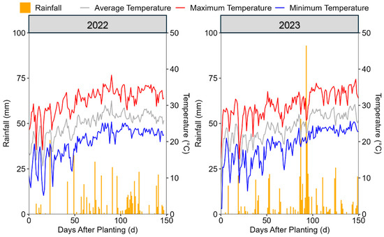 Graphical weather data depicting lines of maximum (red), minimum (blue), and average (grey) temperatures along with bars of total daily rainfall (orange) throughout 2022 and 2023 maize growing seasons.