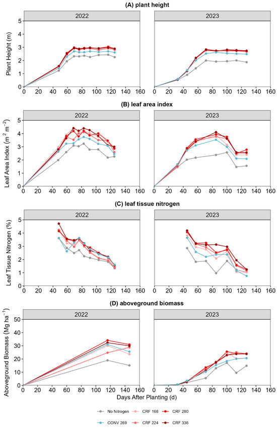 There is a general trend of increasing CRF rates leading to increasing crop growth and health parameters in both the 2022 and 2023 growing seasons. No significant difference in growth parameters was observed between the CRF and CONV treatments during the vegetative growth stages (V8–V12) in both years. The no-N treatment’s plant height, LAI, leaf tissue nitrogen, and aboveground biomass were significantly lower than both the CONV fertilizer treatment and CRF treatments starting from the vegetative growth stages (Supplement Materials, Figures S1–S8). As the maize crops start to develop into the reproductive stage (R3), the separation between the no-N treatment and all other fertilizer treatments becomes greater (Supplement Materials, Figures S1–S8). The LAI values of the CRF336, CRF280, CRF224, CRF168, and CONV296 treatments were 31%, 29%, 27%, 35%, and 23% higher than those of the no-N treatment in 2023 at R3, respectively. Similarly, the aboveground biomass at harvest for the CRF336, CRF280, CRF224, CRF168, and CONV296 treatments was 34%, 34%, 46%, 36%, and 31% higher than that of the no-N treatment in 2023, respectively. However, no significant difference in growth parameters was observed between CRF treatments.