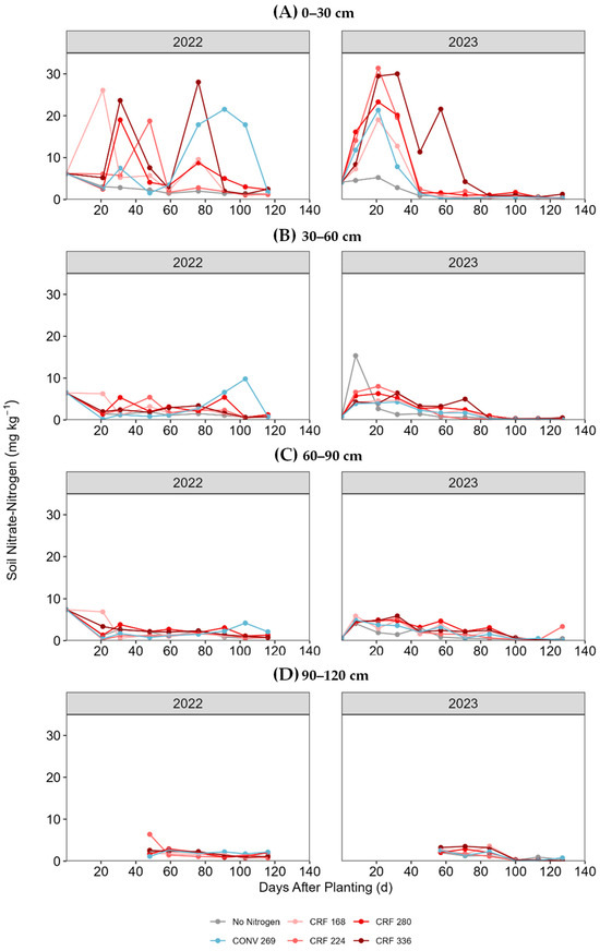 Differing fertilizer application amounts and release mechanisms influenced the dynamics of available soil NO3-N and its movement in the soil profile (0–120 cm) throughout the 2022 and 2023 growing seasons (Figure 3). The 0–30 cm layer held most of the soil NO3-N, which was expected as (i) CRF pellets and CONV fertilizer are applied in this soil layer, and (ii) desired as roots can readily take up NO3-N at this shallow depth. There was large variability and spiking among CRF treatments in this 0–30 cm range, but little spiking at depths below 30 cm, illustrating that the pelleted nature of CRFs likely allowed nutrients to be held in the soil profile. However, movement of the NO3-N to deeper depths was seen in the CONV fertilizer treatments in 2022. For example, a large spike of NO3-N is apparent in the CONV fertilizer treatment in the 0–30 cm range at roughly 90 DAP (Figure 3A), and as time progresses, NO3-N is seen spiking at the 30–60 cm range (Figure 3B), then the 60–90 cm range (Figure 3C), and a fraction is eventually seen in the 90–120 cm range (Figure 3D), corroborating the vulnerability of CONV fertilizers to downward movement through the soil profile. The presentation of significant differences in soil NO3-N between treatments at various growth stages across growing seasons is provided in the Supplemental Materials, Figures S9 and S10.