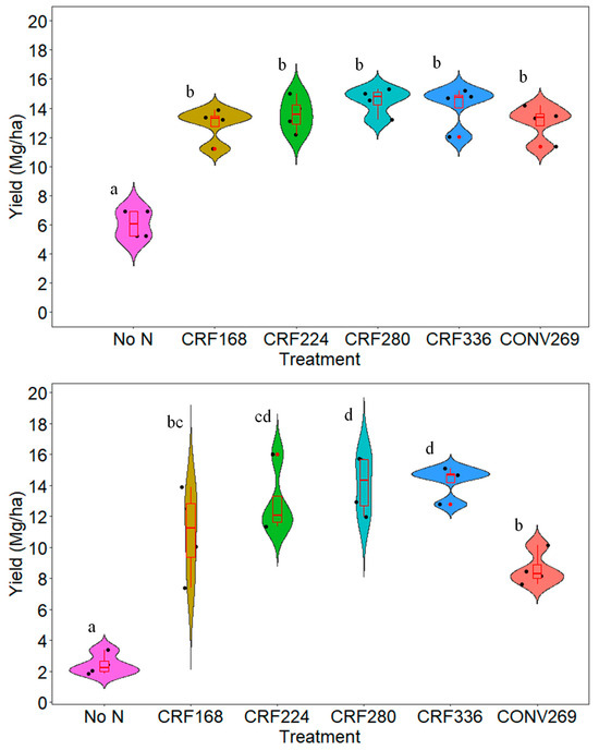 The control no-N treatment yielded more in 2022 than in 2023, with yields of 6.1 Mg ha−1 in 2022 but only 2.4 Mg ha−1 in 2023 (Table 4, Figure 5). A potential cause for these higher yields could be the soil texture differences between 2022 and 2023. A study conducted by [81] which investigated differences between soil types on maize grain yield found that no-N treatments in sandy soils averaged grain yields of 5.8 Mg ha−1 while averaging yields of 9.5 Mg ha−1 in clay soils. Similarly in this study, although both soils were characterized as sandy, larger amounts of clay observed in the 2022 growing season (nearly double those in 2023) resulting in higher residual NO3-N content were linked with higher yields as compared to the 2023 growing season (Table 1). With N playing a key role in crop growth and development, differences in maize grain yield were observed between a no-N treatment and fertilized treatments in both years [82,83,84]. On average, the grain yield of CRF168, CRF223, CRF280, CRF336, and CONV269 was 53%, 55%, 58%, 57% and 54% higher in 2022 and 77%, 81%, 82%, 83%, and 72% in 2023, respectively, than that of the no-N treatment (Table 4). The lower difference in 2022 might be due to the more optimal N uptake and N nutrient release observed in the 2022 growing season, as previously discussed for crop growth and health parameters. This is supported by the fact that all treatments, except for the CRF’s highest rate of 336 kg N ha−1, produced higher yields in the 2022 growing season than in the 2023 growing season (Table 4).