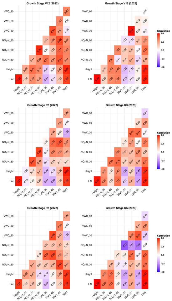 A correlation matrix illustrating the relationships between climatic factors, soil moisture, nitrate-nitrogen (NO3-N) concentrations at different depths, and plant growth attributes at the vegetative (V12) and reproductive (R3 and R5) growth stages during the 2022 and 2023 maize growing seasons. The variables include soil moisture (VWC) at 30 cm, 60 cm, and 90 cm depths (VWC_30, VWC_60, VWC_90, respectively); NO3-N concentrations at three soil depths (NO3-N_30: 0–30 cm, NO3-N_60: 30–60 cm, NO3-N_90: 60–90 cm); and plant growth parameters including plant height (Height) and the leaf area index (LAI). Positive correlations are shown in red, while negative correlations are represented in blue, with the intensity of the color corresponding to the strength of the correlation.