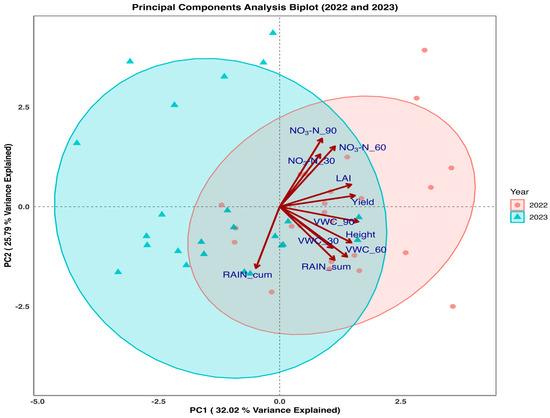 The Principal Component Analysis (PCA) provided an integrated view of the relationships between NO3-N availability, soil moisture, plant growth parameters, and weather variables across the contrasting growing seasons of 2022 and 2023. The first two principal components (PC1 and PC2) explained 57.81% of the total variance, effectively summarizing the key factors driving crop performance and nutrient dynamics under varying environmental conditions (Figure 7).