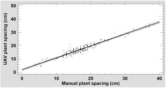 A linear regression model was developed to compare the hand and UAV measurements of plant spacing (Figure 3).