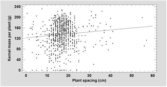 The relationship between kernel (grain) mass per plant and plant spacing was calculated using a linear regression model (Figure 4).