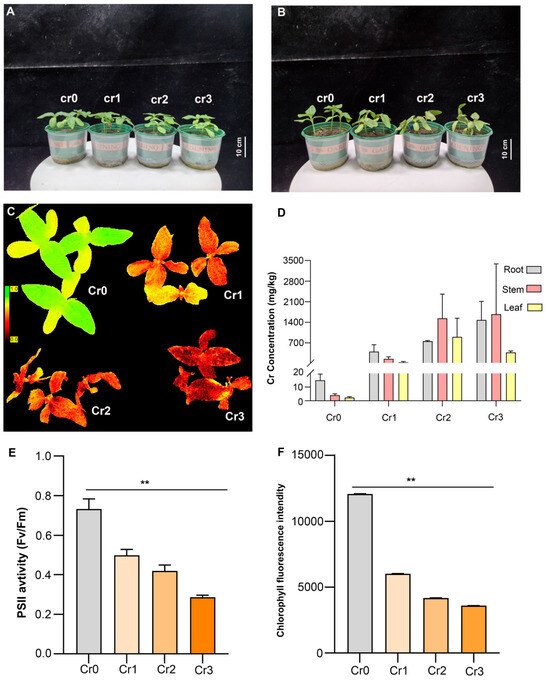 Impact of varying Cr6+ concentrations on sunflower seedlings. (A) Image depicting sunflower growth prior to Cr6+ treatment. (B) Image depicting sunflower growth subsequent to Cr6+ treatment. (C) The Fv/Fm value of sunflowers subjected to various Cr6+ treatments was captured using a chlorophyll fluorescence camera. A redder hue indicates a lower Fv/Fm ratio. (D) Chromium concentrations in various organs of sunflowers subjected to various treatments. (E,F) The Fv/Fm and chlorophyll fluorescence intensity values of sunflowers subjected to various chromium treatments. Utilizing the t-test, ** denotes p < 0.05. Cr0 indicates the absence of Cr, Cr1 signifies 50 mg/kg of Cr, Cr2 denotes 100 mg/kg of Cr, and Cr3 represents 250 mg/kg of Cr.