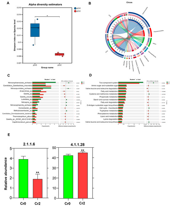 Impact of the heavy metal chromium on rhizosphere microbial development in sunflowers. (A) Effects of the heavy metal chromium on microbial biodiversity in rhizosphere soils. (B) Impact of the heavy metal chromium on the rhizosphere microbial community of sunflowers. The left outer ring denotes various treatments, with Cr0 indicating the absence of chromium application and Cr2 signifying the application of 100 mg K2Cr2O7 per kilogram of soil. The right outer ring illustrates distinct target microorganisms, while the second circle on the right depicts the relative abundance of each microorganism type across different treatments. (C) Impact of heavy metal chromium on microbial species in the sunflower rhizosphere (D) Impact of heavy metal chromium on the KEGG pathway (E) Impact of heavy metal chromium on the betalain biosynthesis pathway. 2.1.1.6 indicating catechol O-methyltransferase and 4.1.1.28 indicating aromatic L-amino acid. * indicating p < 0.05 and ** indicating p < 0.01.